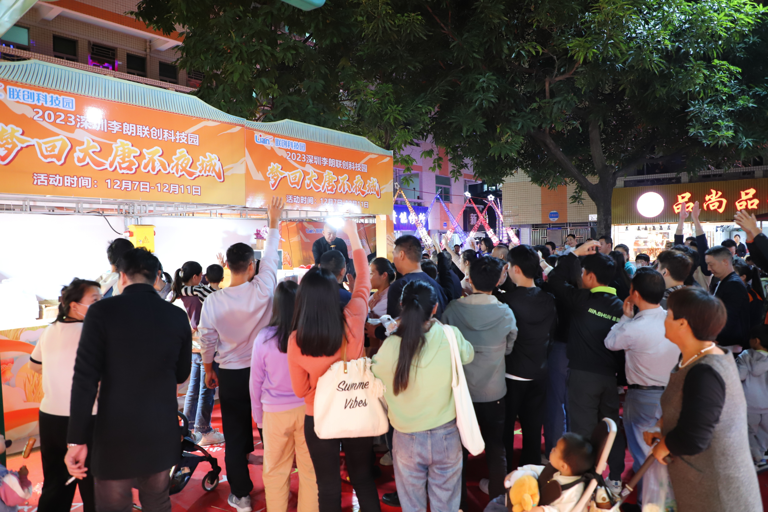 遠赴人間驚鴻宴,一睹人間盛世顏,燈火璀璨,綻放于夜,漫步千年古都,夢回大唐,聯創科技園帶領大家領略這古代韻味。本次活動共有 60個美食攤位,其中市集展位20個,輕奢美食展位40個,1個表演舞臺,并設有游戲區,更有大型玩偶大黃蜂、大熊貓、北極熊與游客互動。男女老少皆可參與游玩。持續時間7號-11號,開幕首日共計數千人員參與。